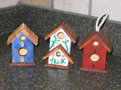 These little gems were fun to paint, only $1.00 @ JoAnns and they add a little accent to the house. The blue one was sort of a watered down look so that the natural wood shows through, the middle is more of a German tribute (notice the shingles on the roof) and the red one I put brown over the top of it to give it an aged look. With the limited talent I have in acrylic painting, I'm pretty pleased with these, I have 2 more to paint, but have none ideas...suggestions?